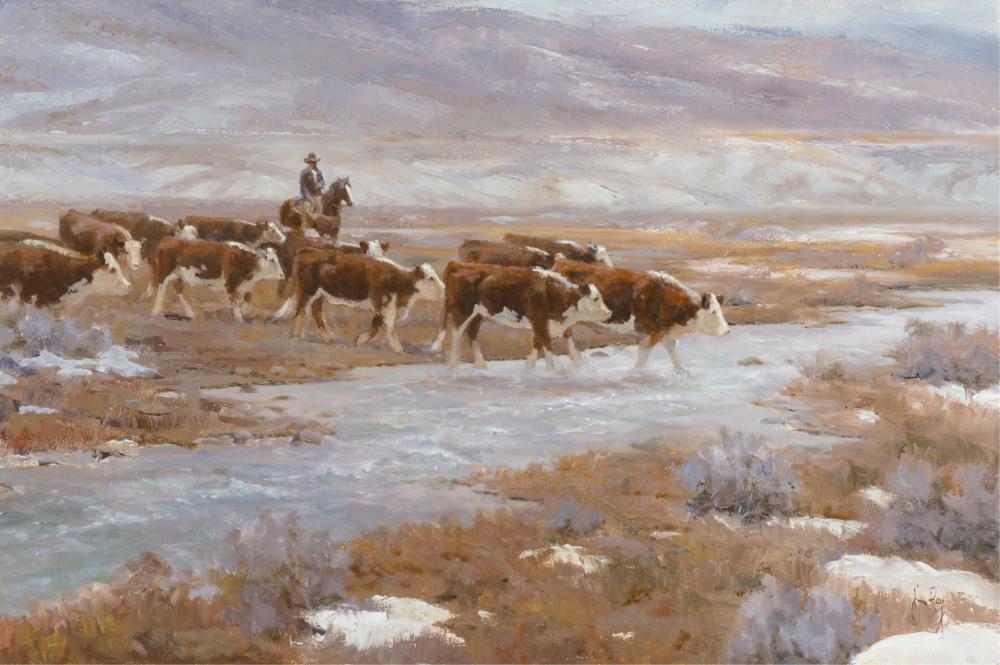 Rey’s impressionistic brushwork conveys movement and atmosphere — from the shifting cattle to the soft, rolling hills fading into the background. The piece showcases his ability to balance realism with loose, expressive strokes, creating a composition that feels lived-in and genuine.